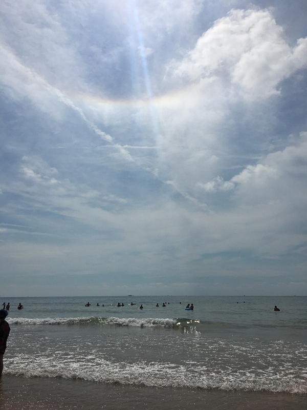 到青島,最不容錯(cuò)過的就是陽光、沙灘、水中暢游啦!來到石老人海水浴場(chǎng),放眼望去是蔚藍(lán)色的海洋,萬里的長(zhǎng)空飄著潔白的云朵,遠(yuǎn)處天空還出現(xiàn)了彩虹。