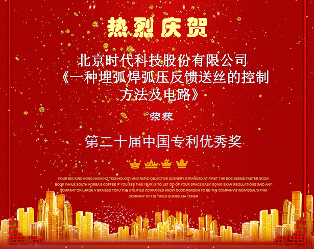 國家知識產權局于20181226日發布“關于第二十屆中國專利獎授獎的決定”,北京時代科技股份有限公司專利《一種埋弧焊弧壓反饋送絲的控制方法及電路》榮獲第二十屆中國專利優秀獎。