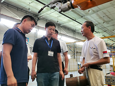儀式活動開始前,協(xié)會各位領(lǐng)導(dǎo)在羅總的陪同下參觀了濟(jì)南焊接工業(yè)園,同時現(xiàn)場考察和了解了機器人焊接培訓(xùn)基地的設(shè)備狀況、人員狀況和培訓(xùn)活動開展情況。協(xié)會領(lǐng)導(dǎo)針對基地的管理和運轉(zhuǎn)現(xiàn)狀予以肯定,同時提出了不少寶貴的建議。