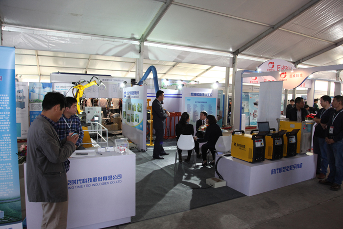 時代焊機作為職業教育領域的優秀焊接設備供應商應邀參加了本屆展會。展會的展位都設置在組委會搭建的臨時性展棚中,時代展臺的位置在C館的中央。展會中只有三家企業與焊接專業相關,時代是唯一一家專業焊接設備制造企業,其余兩家都是焊接模擬培訓儀的廠家。時代的展品以全新TD系列焊機集控系統、弧焊機器人設備為主。為了展示時代焊機的焊接教學系統解決方案,公司按真實尺寸1:1復制了焊接實操工位。工位里包括標準除塵系統、數字化焊接電源、焊機支撐架、多功能焊接操作架、監控探頭、氣瓶架及氣瓶、工具柜、槍掛鉤等,與真正的教學工位一模一樣。許多從事焊接教學工作的校長、老師對時代焊接實操工位很感興趣,大家仔細觀摩并詢問了不少細節問題。大家紛紛評價時代的工位實物展示全面細致,令人耳目一新。工位外四套時代焊機聯網組成的集控系統同樣吸引了大家的目光,老師們紛紛詢問該系統在實際教學和生產中的實際意義和用途,對時代新型焊機的外觀也大加贊賞。最吸引觀眾目光的還是時代弧焊機器人系統,本次展示包括機器人本體和小型變位機一套。機器人配合變位機焊接零件的過程,動作靈活準確。為了強化展出效果,展臺上布置了兩盞大功率的射燈將機器人照亮,耀眼的燈光將時代機器人高精度、高智能的風范勾畫得淋漓盡致。老師們對機器人的價格十分關心、同時還咨詢了不少教學系統編程問題。