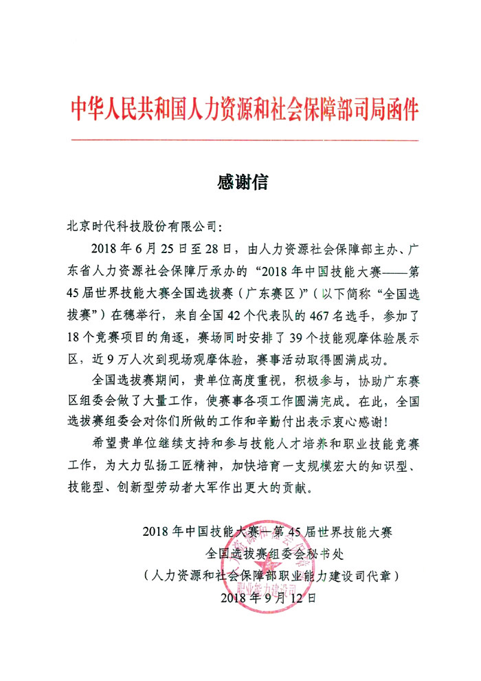 | 2018-09 | 第45屆世界技能大會(huì)全國(guó)選拔賽 組委會(huì)感謝信 | 中國(guó)人力資源和社會(huì)保障部職業(yè)能力建設(shè)司 |