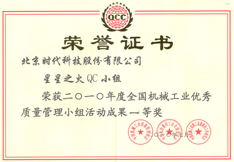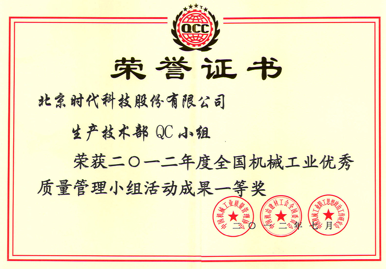 | 2010-07 | 全國(guó)機(jī)械工業(yè)優(yōu)秀質(zhì)量管理小組活動(dòng)成果一等獎(jiǎng) | 中國(guó)機(jī)械工業(yè)質(zhì)量管理協(xié)會(huì) |