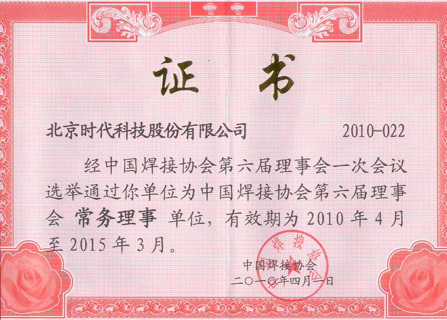 | 2010-04 | 中國(guó)焊接協(xié)會(huì)第六屆理事會(huì)常務(wù)理事單位 | 中國(guó)焊接協(xié)會(huì) |