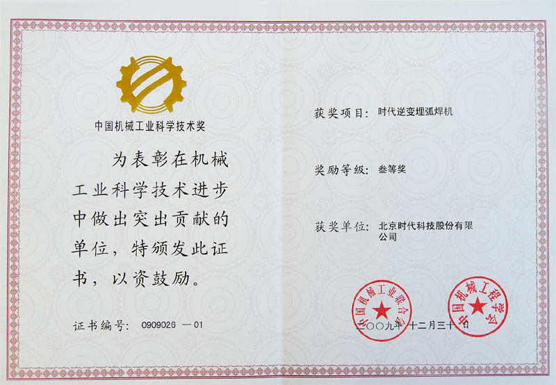 | 2009-12 | 中國(guó)機(jī)械工業(yè)科學(xué)技術(shù)獎(jiǎng) 時(shí)代逆變埋弧焊機(jī) | 中國(guó)機(jī)械工程學(xué)會(huì) |
