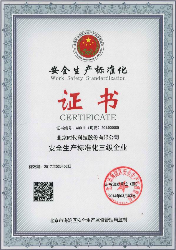 | 2014-04 | 安全生產(chǎn)標(biāo)準(zhǔn)化證書(shū) | 北京市海淀區(qū)安全生產(chǎn)監(jiān)督管理局 |