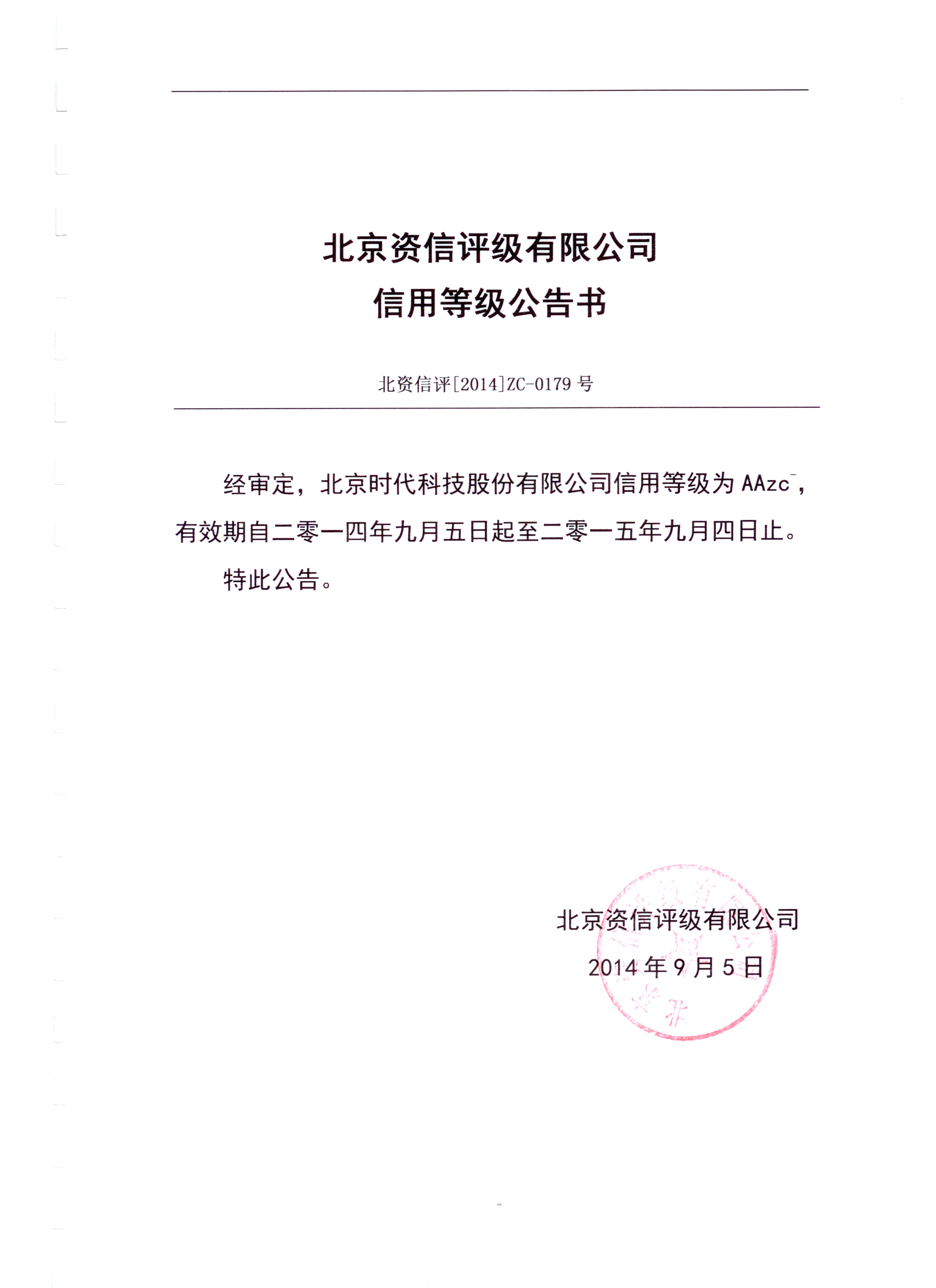 | 2014-11 | 北京時(shí)代科技股份有限公司信用等級(jí)公告書(shū) | 北京資信評(píng)級(jí)有限公司 |
