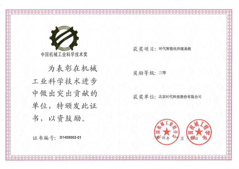 | 2014-12 | 中國(guó)機(jī)械工業(yè)科學(xué)技術(shù)獎(jiǎng) 時(shí)代智能化焊接系統(tǒng) | 中國(guó)機(jī)械工程學(xué)會(huì) |