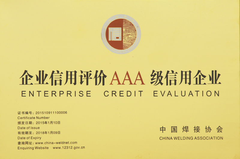 | 2015-03 | 企業(yè)信用評(píng)價(jià)AAA級(jí)信用企業(yè) | 中國(guó)焊接協(xié)會(huì) |