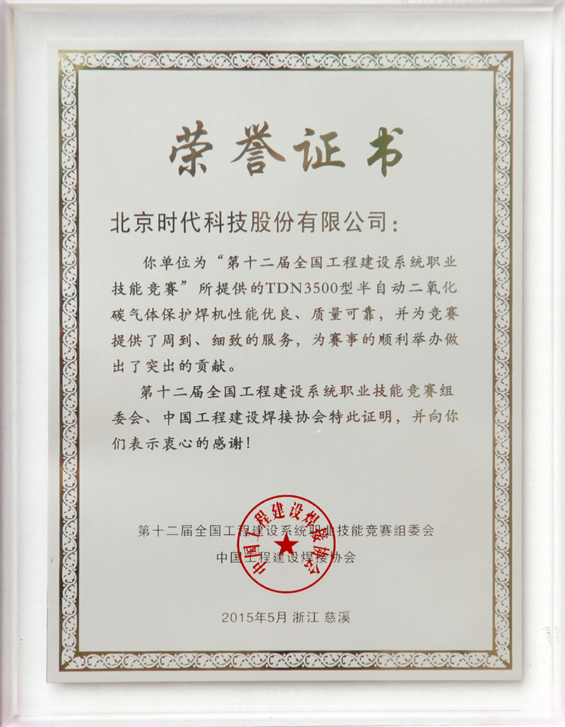 | 2015-05 | 第十二屆全國(guó)工程建設(shè)系統(tǒng)職業(yè)技能競(jìng)賽榮譽(yù)證書(shū) | 中國(guó)工程建設(shè)焊接協(xié)會(huì) |