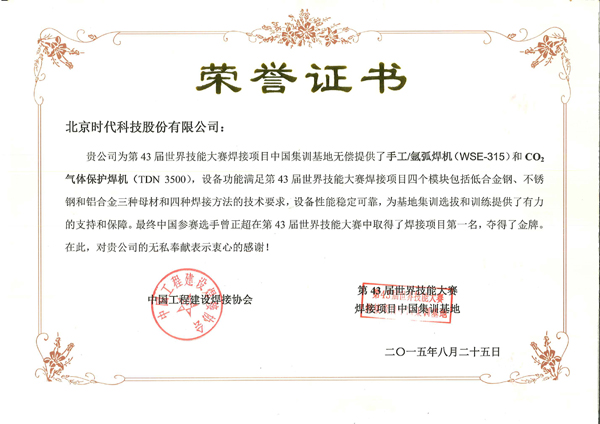 | 2015-08 | 第43屆世界焊接大賽焊接項(xiàng)目集訓(xùn)用機(jī) | 中國(guó)工程建設(shè)焊接協(xié)會(huì) |