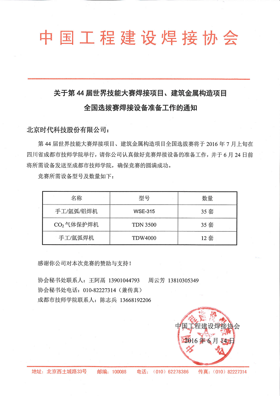 | 2016-06 | 第44屆世界技能大賽焊接項(xiàng)目、建筑金屬構(gòu)造項(xiàng)目全國(guó)選拔賽唯一指定用機(jī) | 中國(guó)工程建設(shè)焊接協(xié)會(huì) |