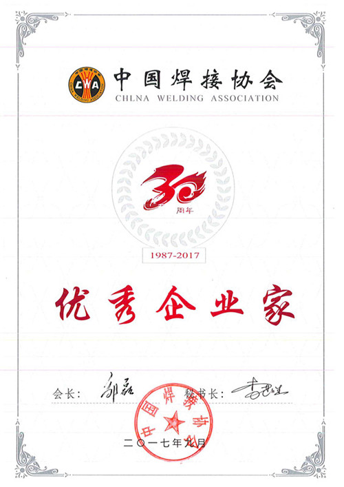 | 2017-09 | 中國(guó)焊接協(xié)會(huì) 優(yōu)秀企業(yè)家 | 中國(guó)焊接協(xié)會(huì) |