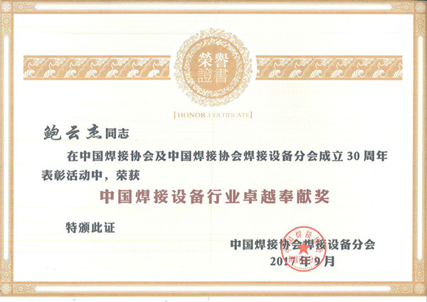| 2017-09 | 中國(guó)焊接設(shè)備行業(yè)卓越奉獻(xiàn)獎(jiǎng) | 中國(guó)焊接協(xié)會(huì)焊接設(shè)備分會(huì) |